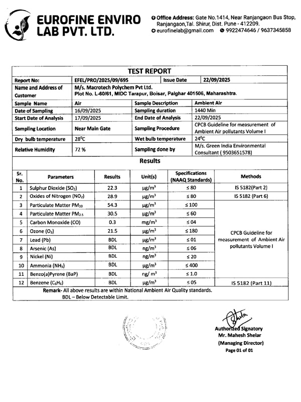 MPCB & DISH (Department of Industrial Health and Safety) Approved