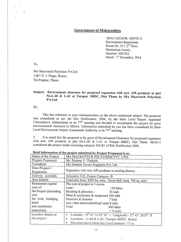 MPCB & DISH (Department of Industrial Health and Safety) Approved