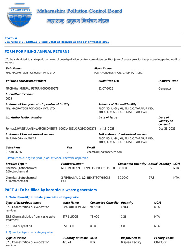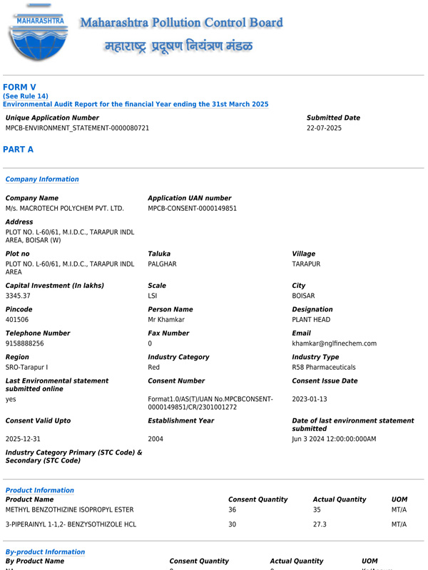At Macrotech Polychem Pvt. Ltd., we believe that a safe workplace and a healthy environment are fundamental to our operational excellence. Our EHS policy ensures that we meet all regulatory requirements while fostering a culture of safety for our employees and the surrounding community.